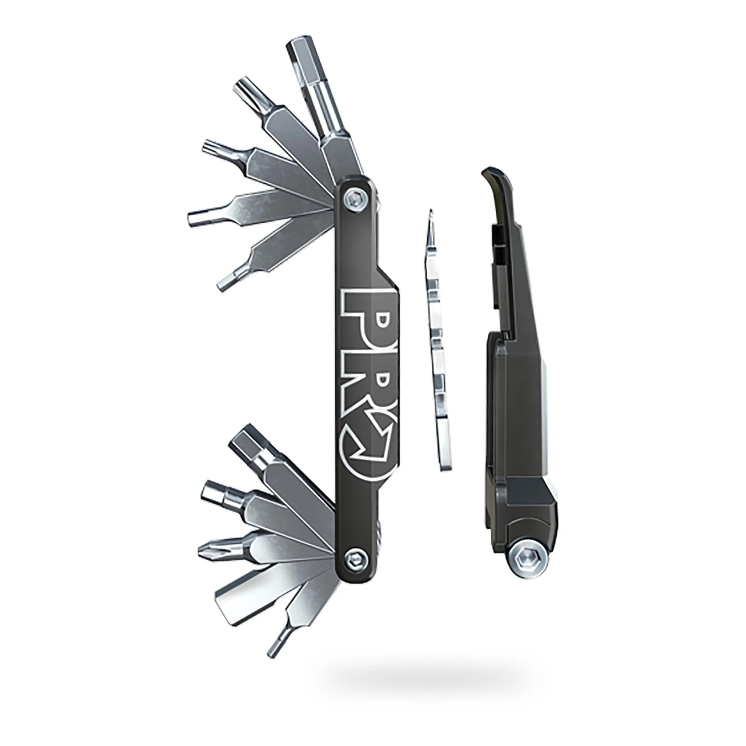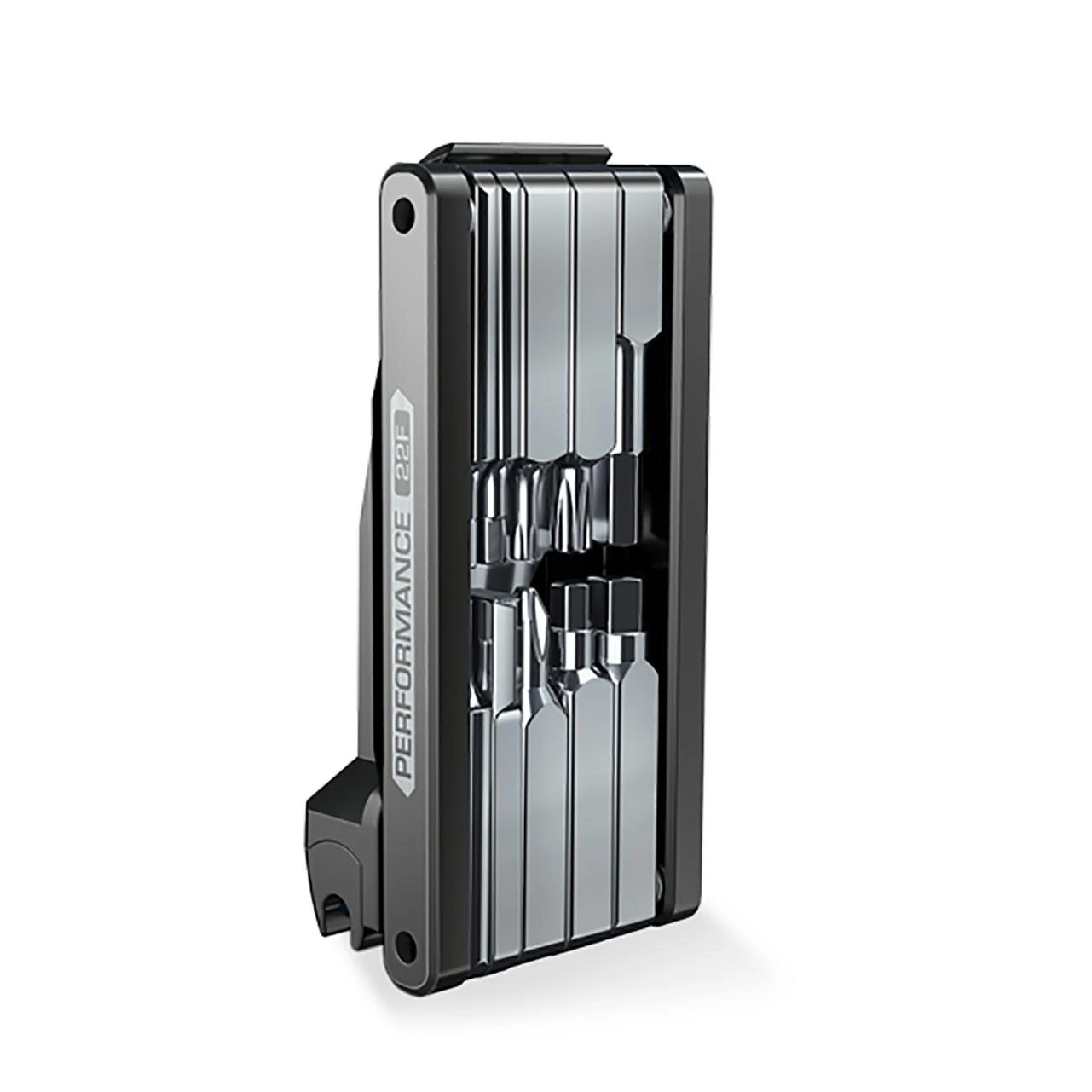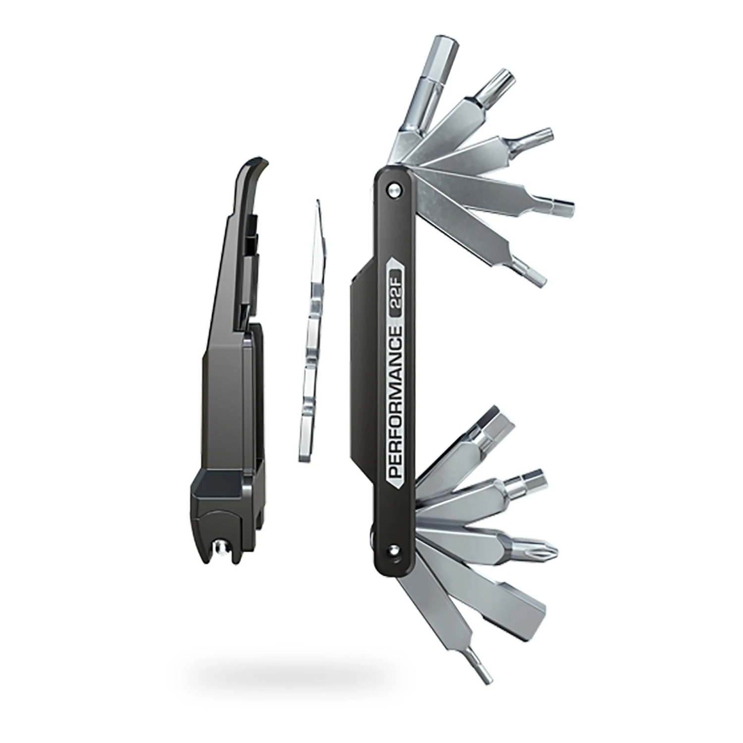 Ce multi-outil PRO Performance est un sauveur bienvenu en pleine montagne lorsqu’un ennui mécanique vient s’inviter à une sortie de vélo route ou de VTT. Véritable atelier portable, cette pièce propose 22 fonctions toutes aussi utiles les unes que les autres. Parmi les outils stratégiques, on retrouve de multiples clés Allen, clés Torx mais aussi un dérive-chaîne compatible avec les transmission 12 vitesses ainsi qu’une clé à rayon. Aussi, le démonte-pneu assure en cas de crevaison. Compact et facilement transportable dans une sacoche de selle, une poche de maillot ou un bidon porte-outils, cet outil est construit en alliage d’aluminium très robuste avec des embouts en acier trempé. La durabilité donne rendez-vous à toutes vos envies cyclistes !