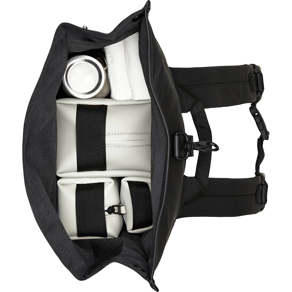Les caractéristiques adaptées au cyclisme comprennent un anneau en D à l’avant, idéal pour les cadenas de vélo et une sangle de poitrine à boucle pour un ajustement sûr à l’épreuve du cyclisme. Il est fabriqué dans le tissu PU imperméable caractéristique de Rains, conçu pour offrir une résistance au transport, une durabilité et une sensation de douceur.
