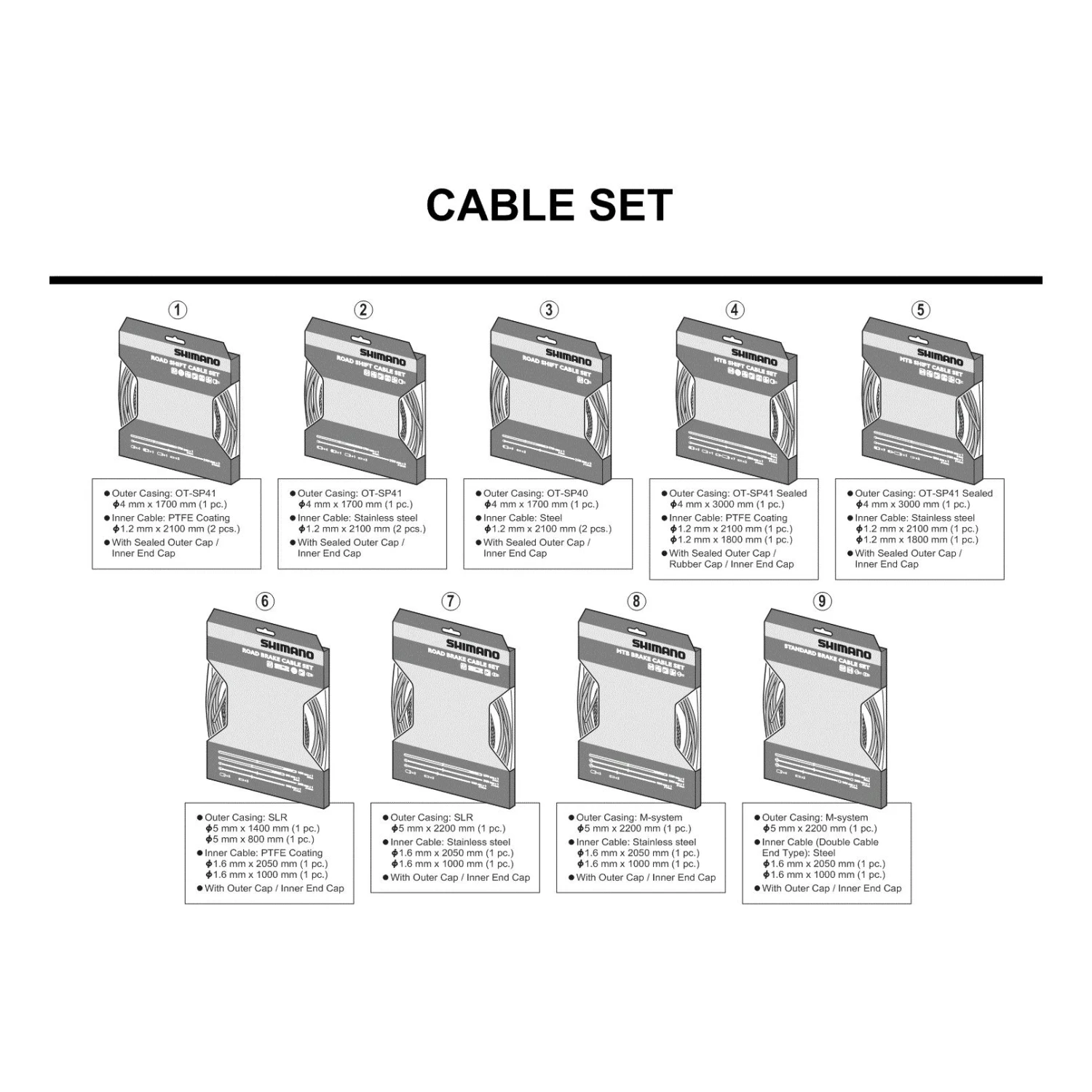 Il est composé de 2 câbles de de dérailleurs en acier inoxydable de 1,2mm de diamètre et d’une longueur de 2100mm et 1800mm, d’une gaine de 2200mm et de tous les bouchons et butées nécessaire pour cette remise à neuf.