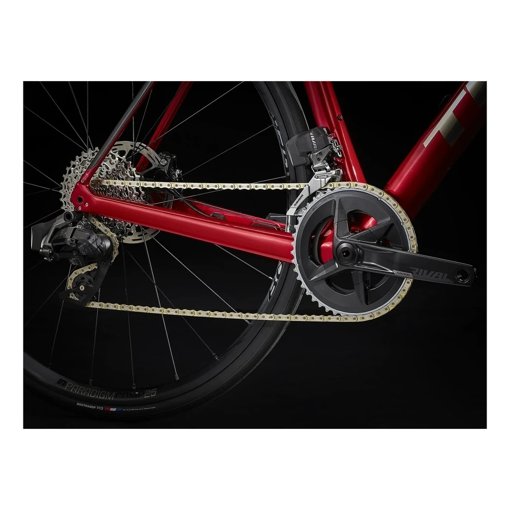 Les périphériques qui composent cette machine de course sont aussi étudiés pour permettre de gagner des watts supplémentaires et garder une maitrise totale de son vélo à l’entrainement. Ainsi, on retrouve des roues robustes Bontrager Paradigm Comp qui conviendront à un usage intensif à l’entrainement. L’ensemble cintre/potence est également assuré par Bontrager tandis que l’élégant compartiment de stockage interne constitue un espace intéressant pour le transport d’outils, chambre à air, démonte-pneus ou cartouche de CO2 nécessaires en cas de crevaison.