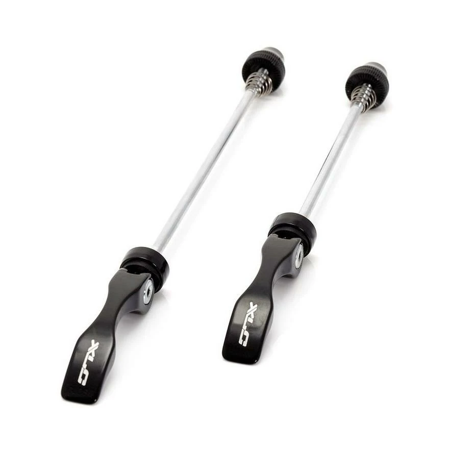 Cette paire de serrage rapide se destine à des roues de vélo traditionnelles à freinage patins. Le kit comprend un axe pour la roue avant de dimension 9x100mm et un autre pour la roue arrière (9x130mm). Très robustes grâce à une structure avec axe en acier et levier en aluminium, ils garantissent une tenue parfaite de la roue et une grande longévité.